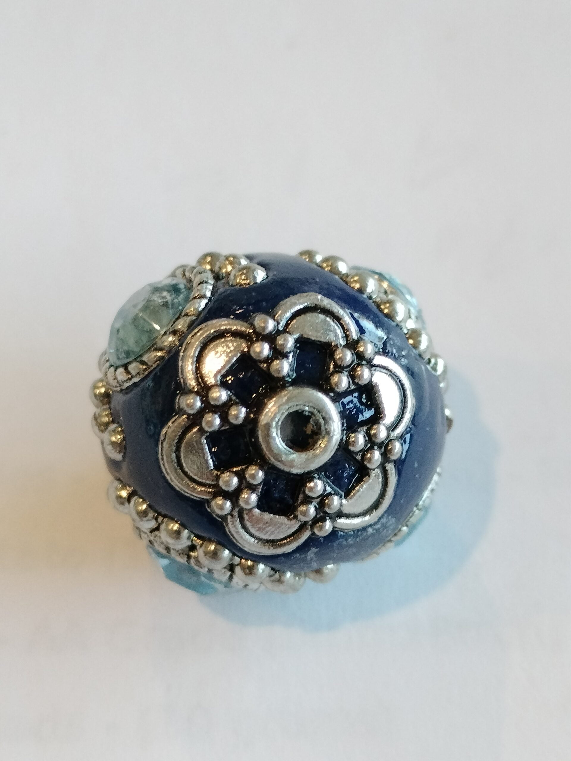 The Navy Blue Artistic Kashmiri Bead is a stunning handcrafted jewellery bead known for its intricate details and rich, deep blue colour. Decorated with silver accents and embedded glass stones, this bead has a unique vintage charm, perfect for creating elegant and exotic jewellery pieces. Made from a mix of high-quality materials, Kashmiri beads are prized for their artisan craftsmanship. These beads are commonly used in necklaces, bracelets, and earrings, adding a touch of luxury and culture to handmade jewellery designs. Their bold appearance makes them ideal for statement pieces or custom jewellery creations.